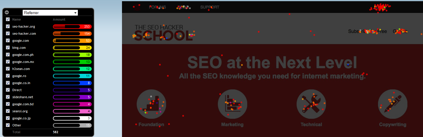 One other thing I love about Crazyegg is their Confetti tool. It tells you where the clicks came from. In this case, there are lots of clicks that came from other parts of our site (seo-hacker.org) and there were clicks that came from the main site (seo-hacker.com). Other than that, search engines and Slideshare seem to refer the rest of our clicks.