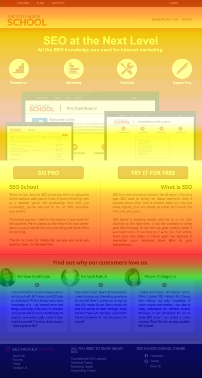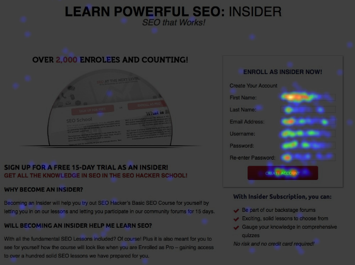 Heat Maps are an awesome way to know where people are clicking. Here’s a heat Map taken from our free registration page in SEO School: