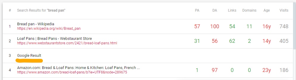 - Top 10 Google Results: Your keyword’s top 10 claimants are displayed in the horizontal box below, right beside columns of useful information that could help you determine how hard it would be to outrank them. Here’s what they mean: