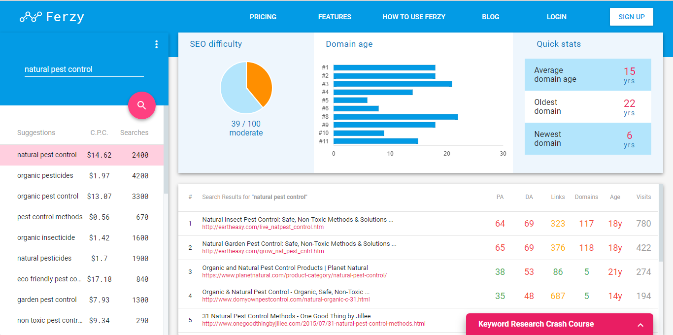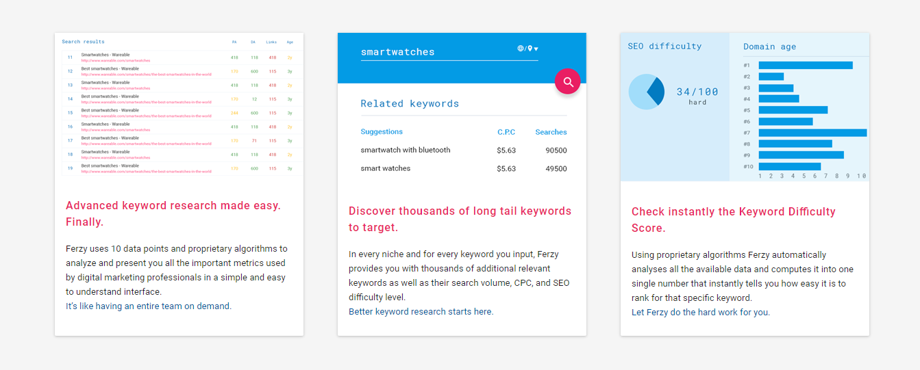 A relatively new entry in the market, Ferzy is an all-around keyword research tool that provides its users with a bird’s eye view of their chosen keyword and its related metrics in an easily digestible interface. Perfect for both beginner and advanced users alike, it shines when it’s used for projects that require speed and precision.
