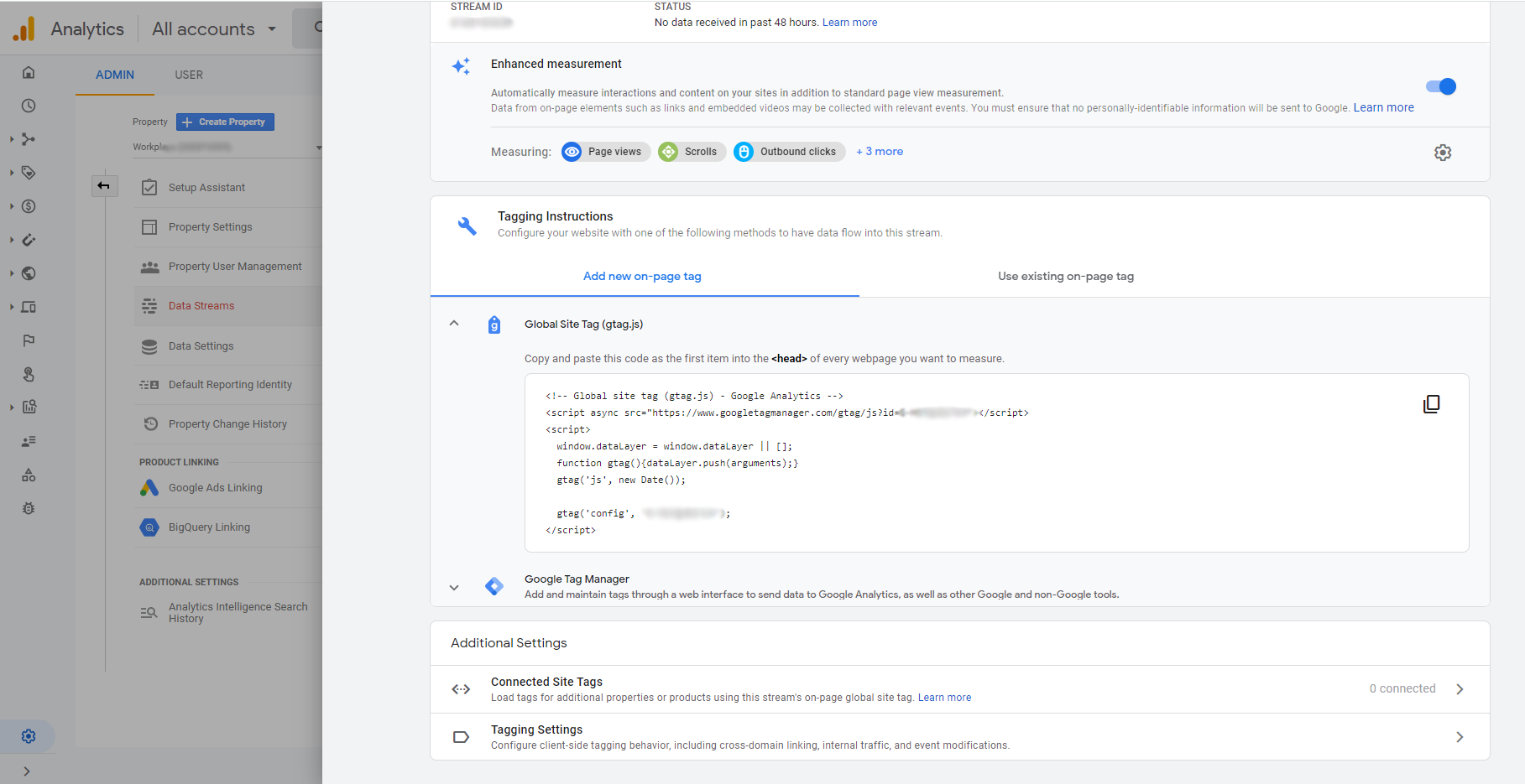 If you are using the gtag.js tag on your website, you can enable data collection using the existing tag on your website. This means that you don’t have to add a new tracking code to your website. I highly recommend that you read this help document from Google Analytics first about the considerations when using connected site tags before using this option.