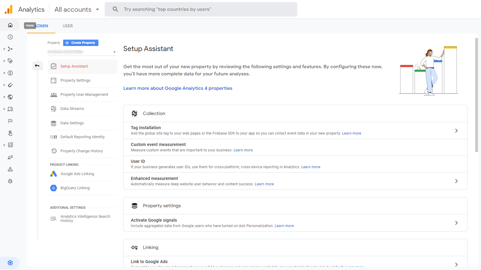 This is just the basic setup. This just makes sure that your new GA4 property is able to track traffic across your website. If you want to dig in deeper, simply go to Admin, click on “Setup Assistant” and there you’ll see where you link your Google Ads account, set user IDs, define your audiences, and more.
