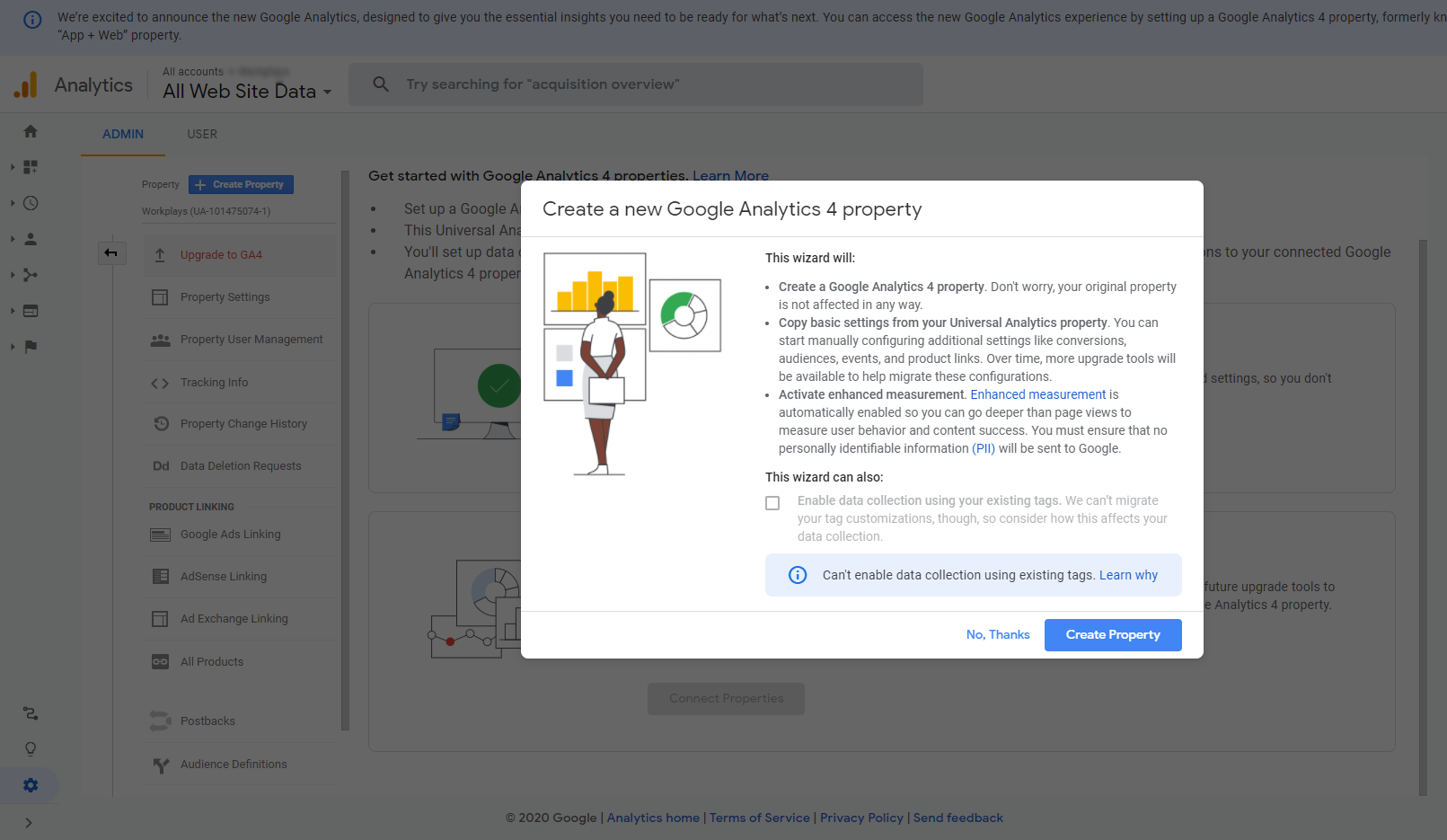 For existing Google Analytics properties, go to Admin and under Property, you should be able to see the button “Upgrade to GA4”. Click on “Get Started” under “I need to Create a New Google Analytics 4 Property”.