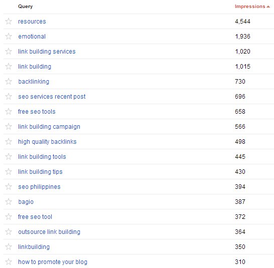 The terms that have high impressions are keywords that you may have targeted or not. If some of the non-targeted keywords are related to your main keywords, then you can use them as your secondary anchor texts in link building. This can help (1) boost your content assets for those non-targeted keywords and (2) get rid of over optimization for your main terms.