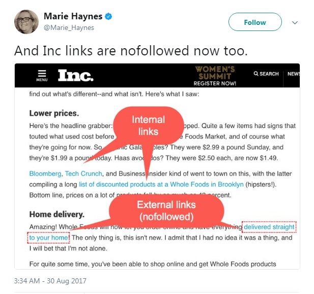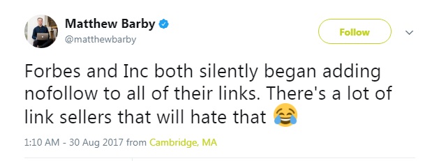 The first instance of influential, high DA website incorporating a nofollow attribute to external links was actually noticed by Matthew Barby, Global Head of Growth and SEO at Hubspot.