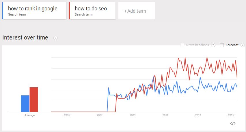 When the term “SEO” was not yet as popular way back in 2007, people were searching for “How to Rank in Google” much more often. Then SEO got a little bit more mainstream and people started shifting to “How to do SEO”. This is not to say that “How to Rank in Google” searches became fewer. It’s just that “How to do SEO” was the right keyphrase to use and so there is a keyword shift that occurred somewhere in 2011 according to Google Trends.