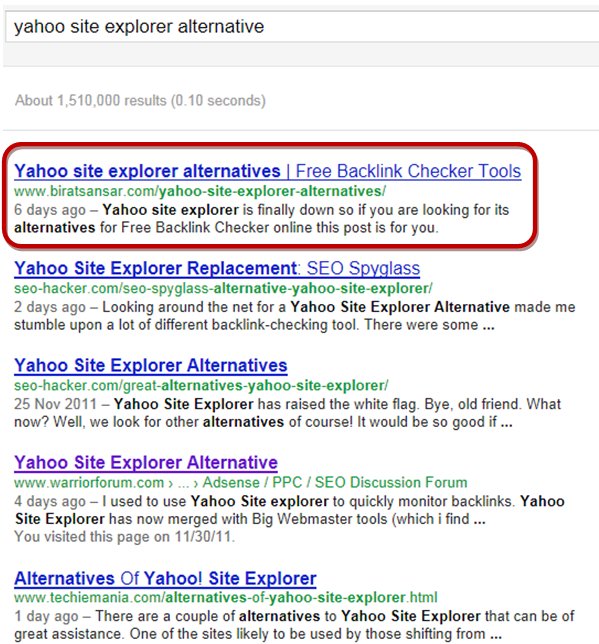 I was playing with the Freshness Algorithm since Yahoo Site Explorer shut down. I immediately tried to compile a resource article that provides all the good, mediocre, and ‘bad’ alternatives to Yahoo Site Explorer in hopes of being one of the firsts to publish it with the keywords ‘Yahoo Site Explorer Alternatives‘. I was sure this keyphrase is going to get a lot of hits.