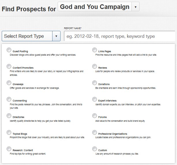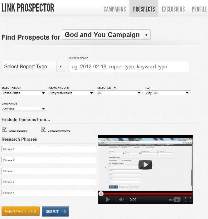 When you are inside your campaign, you can then create a new report. The Prospects section of Link Prospector lets you choose your Report Type and filter your report by Region / Country, Search Scope, Depth, TLD and Date Range. These are very powerful filters and can really help you narrow your prospecting down.