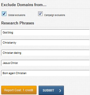 The Research Phrases section is all about your keywords and/or niche. This is where you are telling Link Prospector ‘These are the kinds of websites I’m looking for’. ‘Exclude Domains’ deals with your exclusions (in the exclusions section of the tool) – which you should fill up to tell Link Prospector which URLs you want Link Prospector to exclude from the report. You use the exclusion tool if you have already been to that URL and have contacted the webmaster or you have gotten a successful link, etc