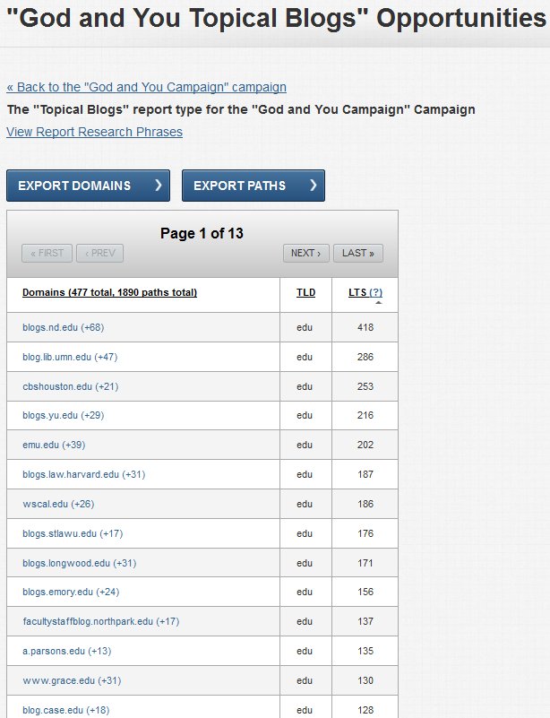Once the report is finished, you can either export it by domain or by path (webpages). The prospect list is described as ‘opportunities’. LTS in the report stands for the Link Target Score – this is most probably calculated with an in-house developed algorithm. – This is what the report looks like: