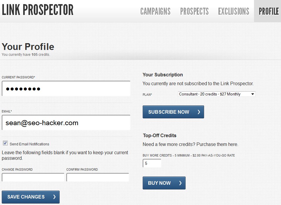 Your Link Prospector profile is where you set your account changes. It’s also where you can top up more credits to use for the reports, and subscribe to the Link Prospector tool.