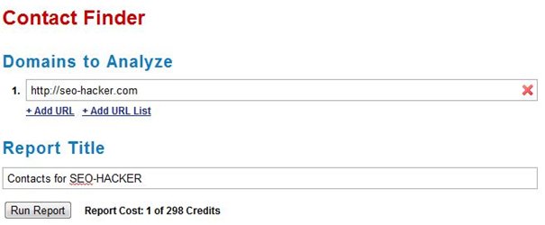 Once you’ve chosen a Website you want to build links into, enter its URL to the Contact finder and click the ‘Run Report’ Button. This is the first and the last step before you see the details regarding your prospect.