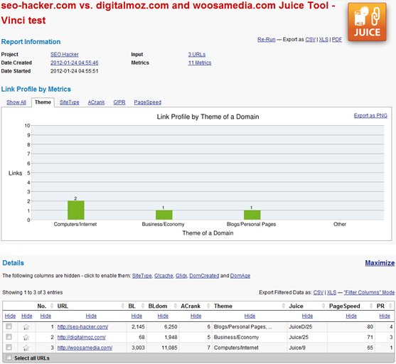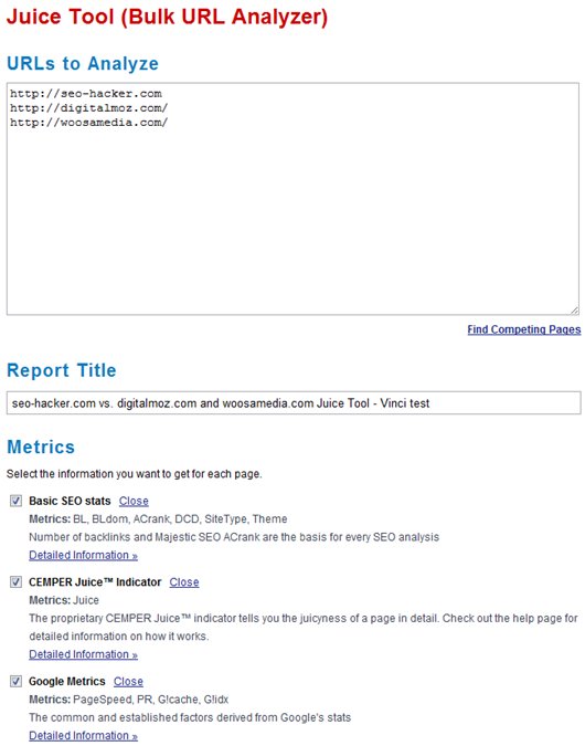 As usual, I have chosen to analyze the URLs of digitalmoz.com, woosamedia.com, and seo-hacker.com. In addition to the Basic SEO stats and Google metrics, I have selected to use the CEMPER Juice Indicator metric as well. The CEMPER Juice Indicator evaluates if the domain and/or pages are good targets for link acquisition.