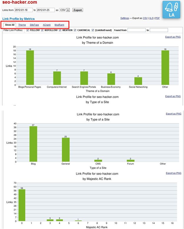 The Bar graphs above shows you a summary of where your links are coming from. For example using the Seo Hacker domain, (as shown in the 1st Bar Graph by Theme of a Domain) this bar graph shows you on what theme of domains you get more links. With this information you can easily adjust on what market niche/ theme you’ll focus your link building strategy. In our case, Seo Hacker is getting links from blogs and other website themes.
