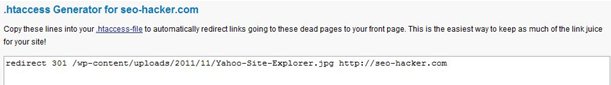 Got too many dead links? That’s easy with the Link Juice Recovery Tool! All you need to do is to copy and paste the .htcaccess code created and all the affected dead links will be redirected to your website’s home page. But, of course, going through the hard way of creating a page for every dead link is still the best solution to dead links.