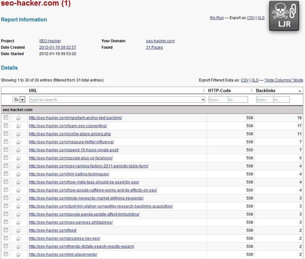 After a few minutes, you’ll be able to see a list of dead links and their error codes analysed from your website. These results also tell you how many back links are affected by the dead links found in your website. This is a great picture to actually inform you, as the web master, how much you are missing due to your dead links.