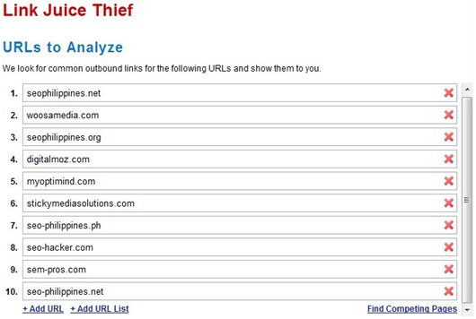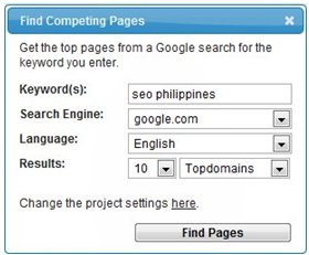 Once you enter the Link Juice Thief module, you can directly enter the URLs of the websites that you want to analyze or you can click the Find Competing Pages link. From there you’ll be able to enter the keyword(s) relevant to the website(s) you want to look up. In this example, I want to look up my competitors for “seo philippines.”