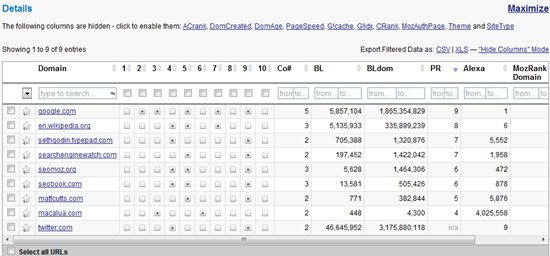 There we go. I have hidden the columns which I don’t need to see and I have set the order of the links by their Page Rank.