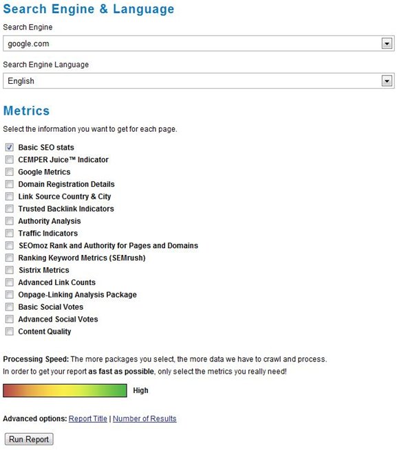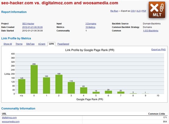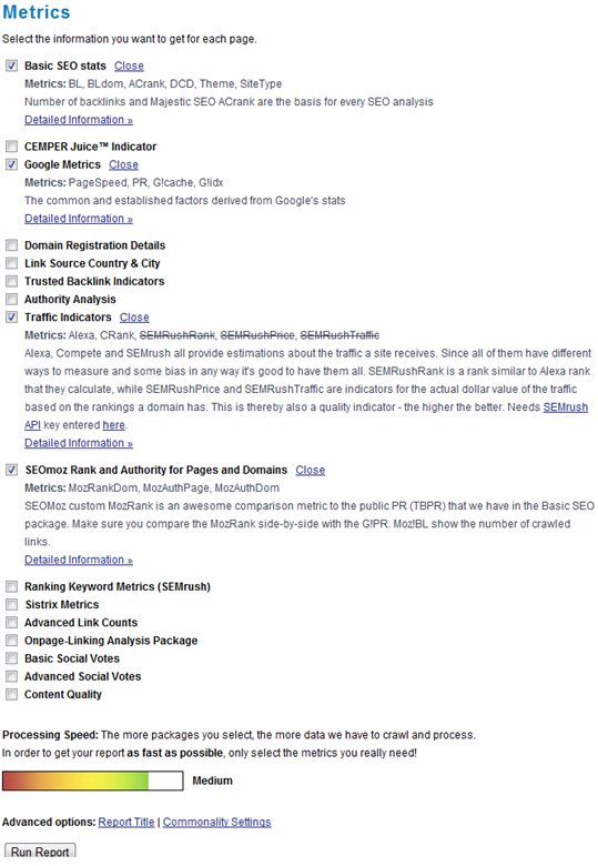 You can also choose the metrics that you want to see in your report. Here I have chosen to see the stats on backlinks, PR, MozRank, and Alexa Rank just to name a few. After you’ve done choosing the metrics you want, click Run Report to start creating it. It will take some time to finish creating the report depending on the number of metrics you’ve chosen to include. The Commonality settings allows you to filter the links to be generated by showing only the links that that match the number of times a page or domain has been linked to by the pages/domains you want analyzed. For this example, I have set it to 2.