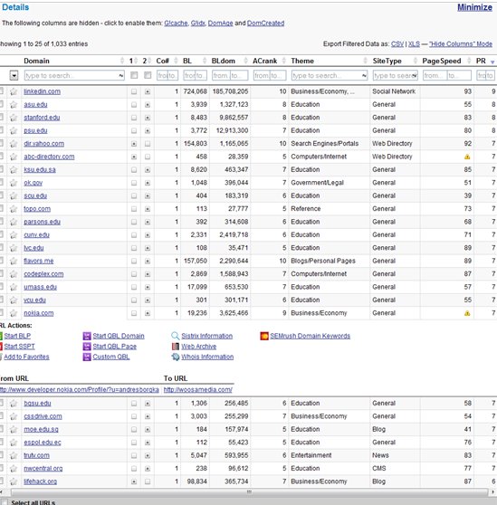 Here you can see that the report generated 1,033 domain backlinks with most of them having a Page Rank of 0 and coming from blogs.