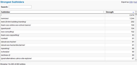 Here we have the strongest subfolders which shows which parts or sections of the website have the highest ranks. From here, you will be able to gauge where you can get the best links possible.