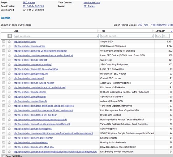 The report generated 291 pages. As expected, my website’s homepage is the strongest page. Generally speaking, it will be difficult to get links from a website’s homepage so you can try to get links from the other top ranking pages.