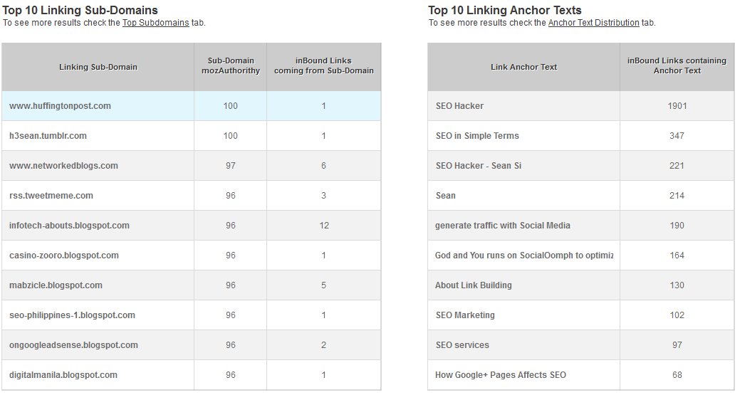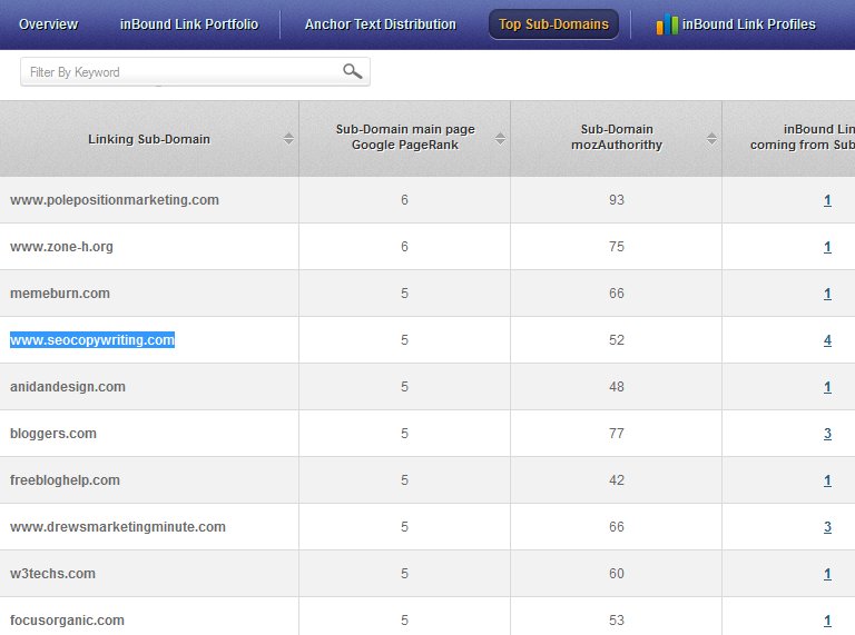 You can also check the top subdomains that are linking to you – their Google PageRank, MozAuthority and the number of their links to you. The tool doesn’t accurately show the sub-domain URL though. Perhaps they will still improve on this.