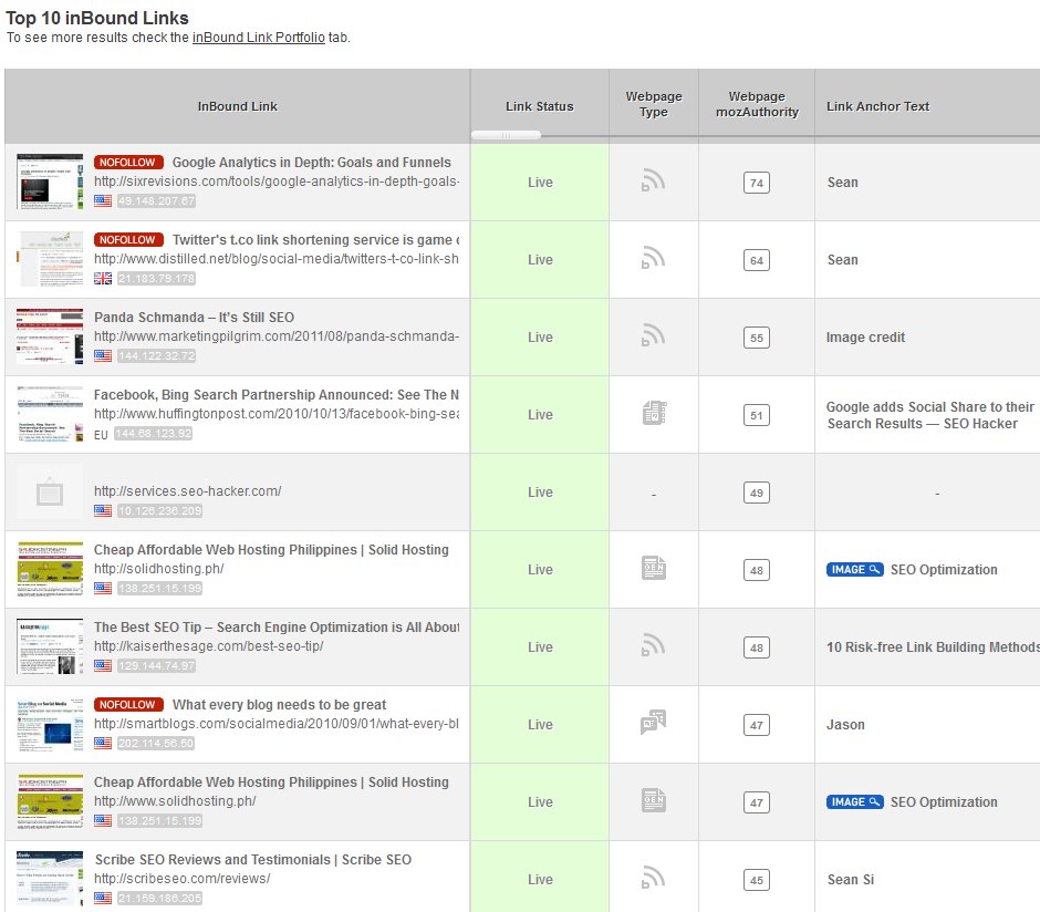 The tool also describes your inbound links in more detail – it even comes with a screenshot. It tells you whether your link is a nofollow link, if your link is an image, the type of website it comes from (blog, news site, generic, etc…), anchor text, link visibility (link placement), link context (if it’s in a group or if it’s in the content), Google PageRank, webpage’s MozRank and the webpage’s MozAuthority. It’s pretty extensive – and solid linkbuilding companies will really appreciate the data that this tool regurgitates to its users.