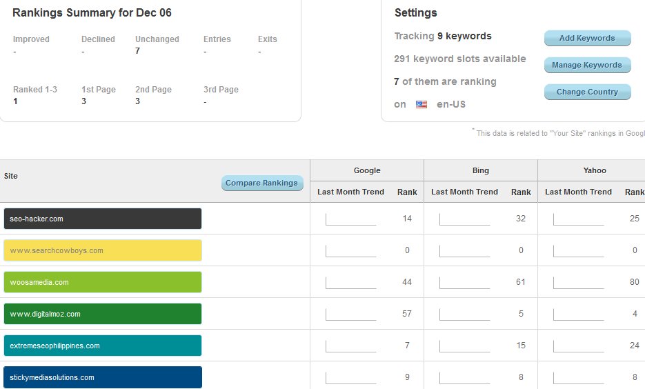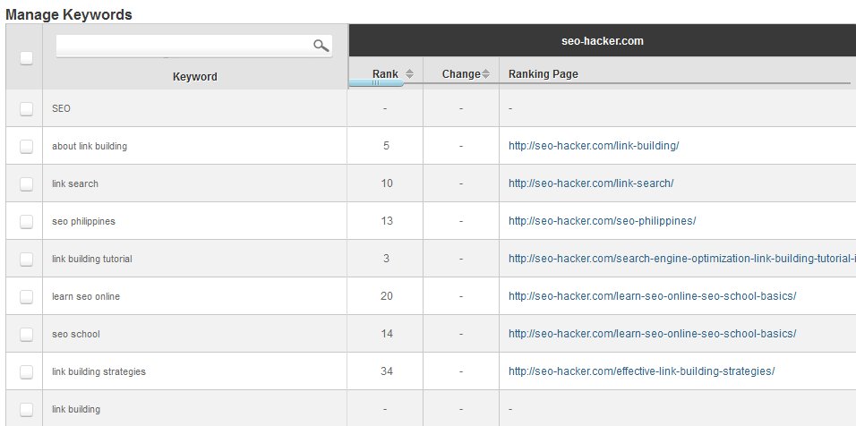 The Rank tracking tool deals with your Search engine rankings with the keywords you’re targeting. For the purposes of testing out this tool, I inserted some keywords that I’m ranking for and some keywords which I’m familiar that these other sites are ranking for.
