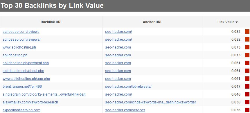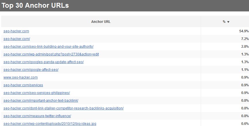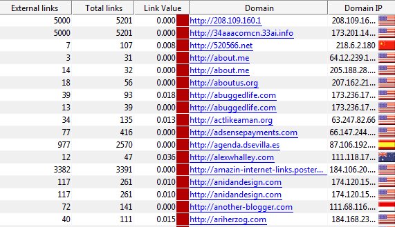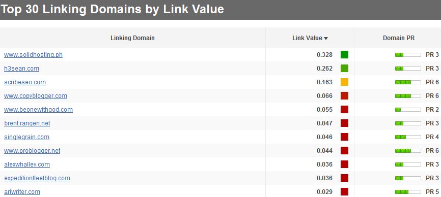 It also displays the top 30 domains that link to me (again by its own way of arranging value). I would think that they derive the value mostly from how we SEO specialists derive link value too – such as domain age, number of outbound links, PageRank, anchor text, etc…