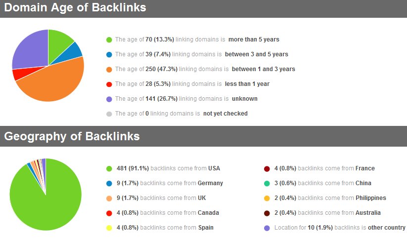 Domain Age matters. That will always be the case. New websites will find it hard to rank, while old ones with reputable domains will find it much easier. SEO Spyglass also tells you where most of your links come from. Since most of the websites from whom I get links from are hosted in the USA, obviously it shows a dominant percentage for that country.
