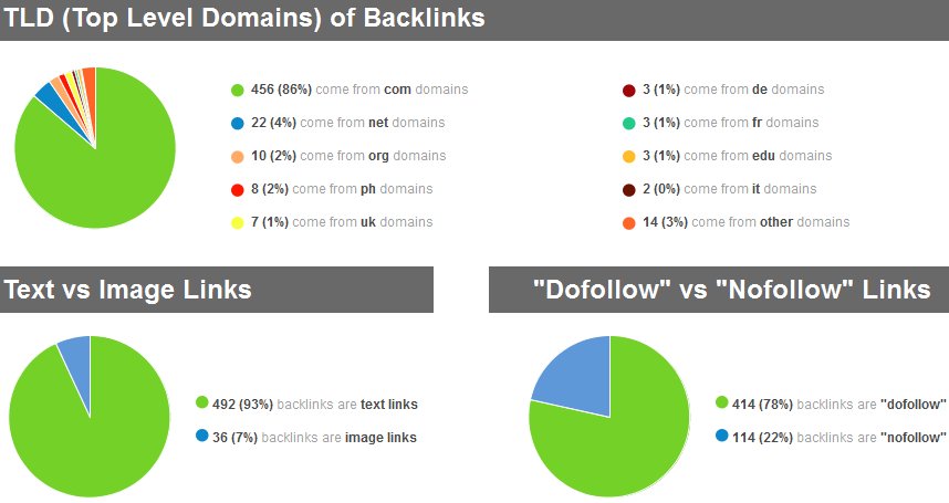 SEO Spyglass also tells you the numbers from which TLD (domain extension) you get your links from, as well as if your link comes from an image and if it is a nofollow/dofollow link.