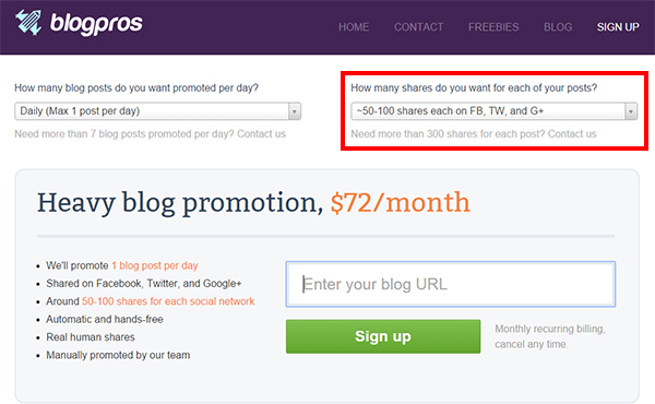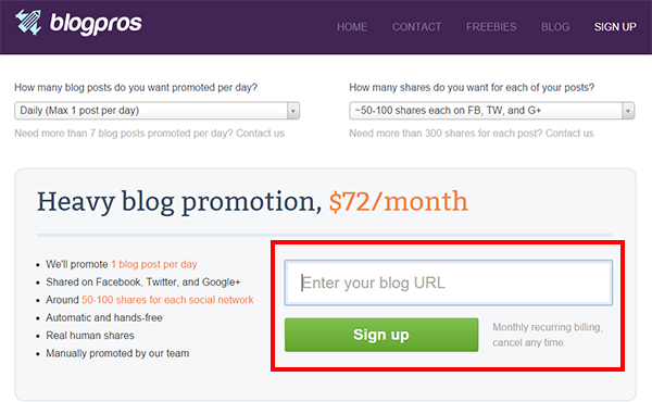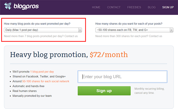 The process is easy, just go to the Blogpros Sign-Up Page, choose how many posts you want Blogpros to promote every day: