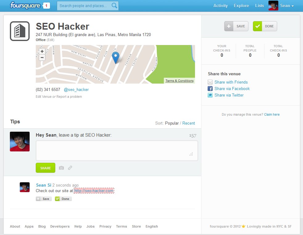 Third, leaving tips in a business location that you ‘Manage‘, allows you to place in a nofollow link to your site. It doesn’t really help your SEO directly but traffic coming in can indirectly raise you up a bit.