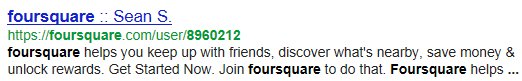 Key takeaway: Foursquare has limited effects on SEO – we have yet to see Foursquare really open up its gates to the SEO world – in fact a user’s profile looks like this: https://foursquare.com/user/8960212