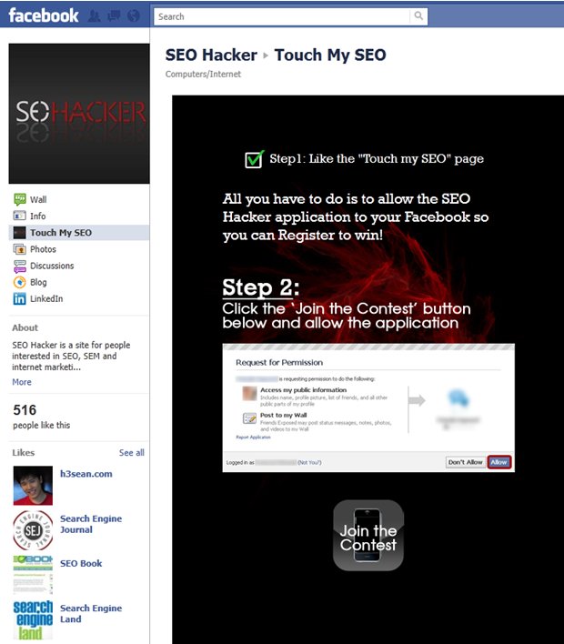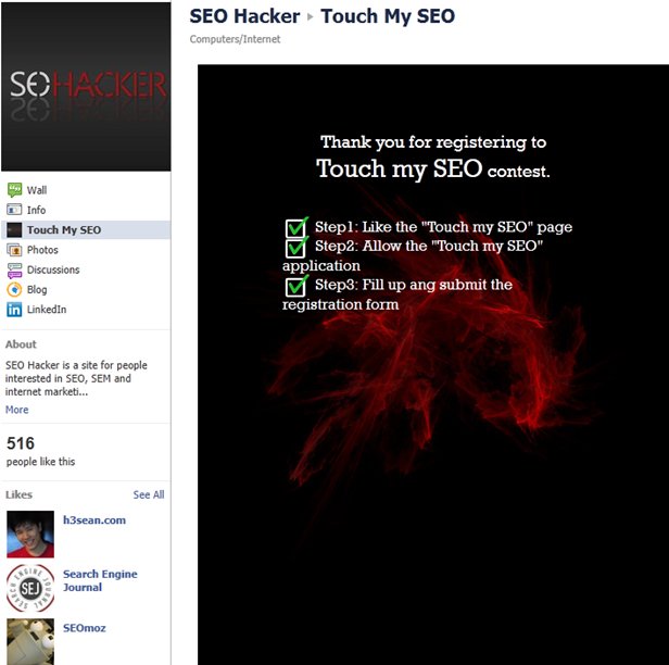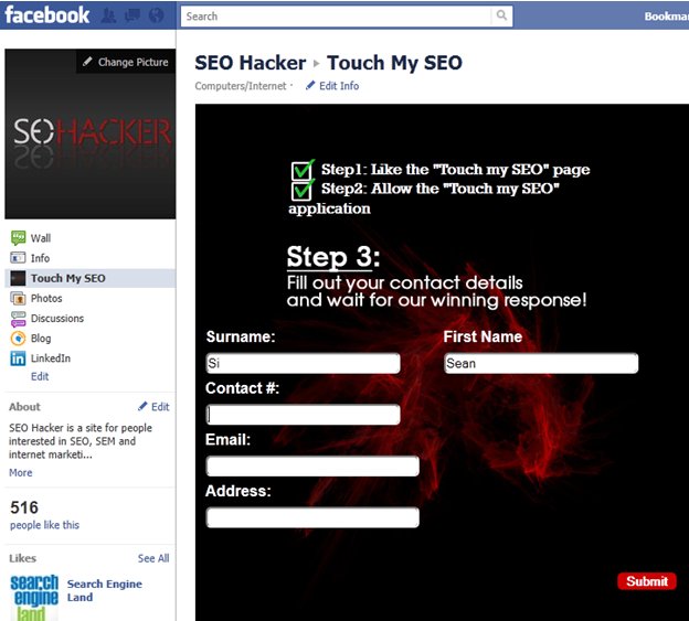 SEO Hacker’s ‘Touch my SEO’ Facebook application is meant to simulate a raffle contest app. As you can see, after the ‘Like’ has been made, the next step is then revealed if you want to join the contest. Of course, if the user has previously already ‘Liked’ the page then he or she would be forwarded to Step 2 without the need to go through Step 1.