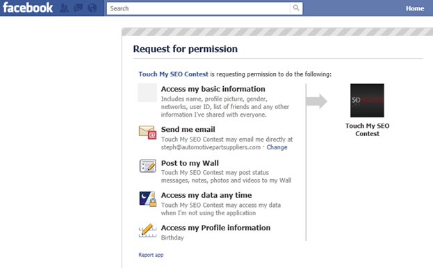 The Facebook app will then request your basic information to be extracted from your Facebook profile into the SEO Hacker database. Of course SEO Hacker will promise to keep the information for contest use only – or other possible interests with their permission. This is a requirement for them in order to enter the contest.