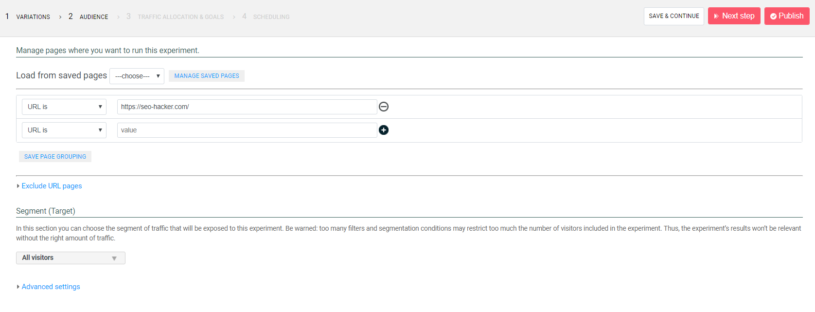The next section is the audience, which helps you manage the pages you would like to run the tests on, and the users that would be able to view the pages. This gives you a more controlled test that would be able to give you the results you are looking for.