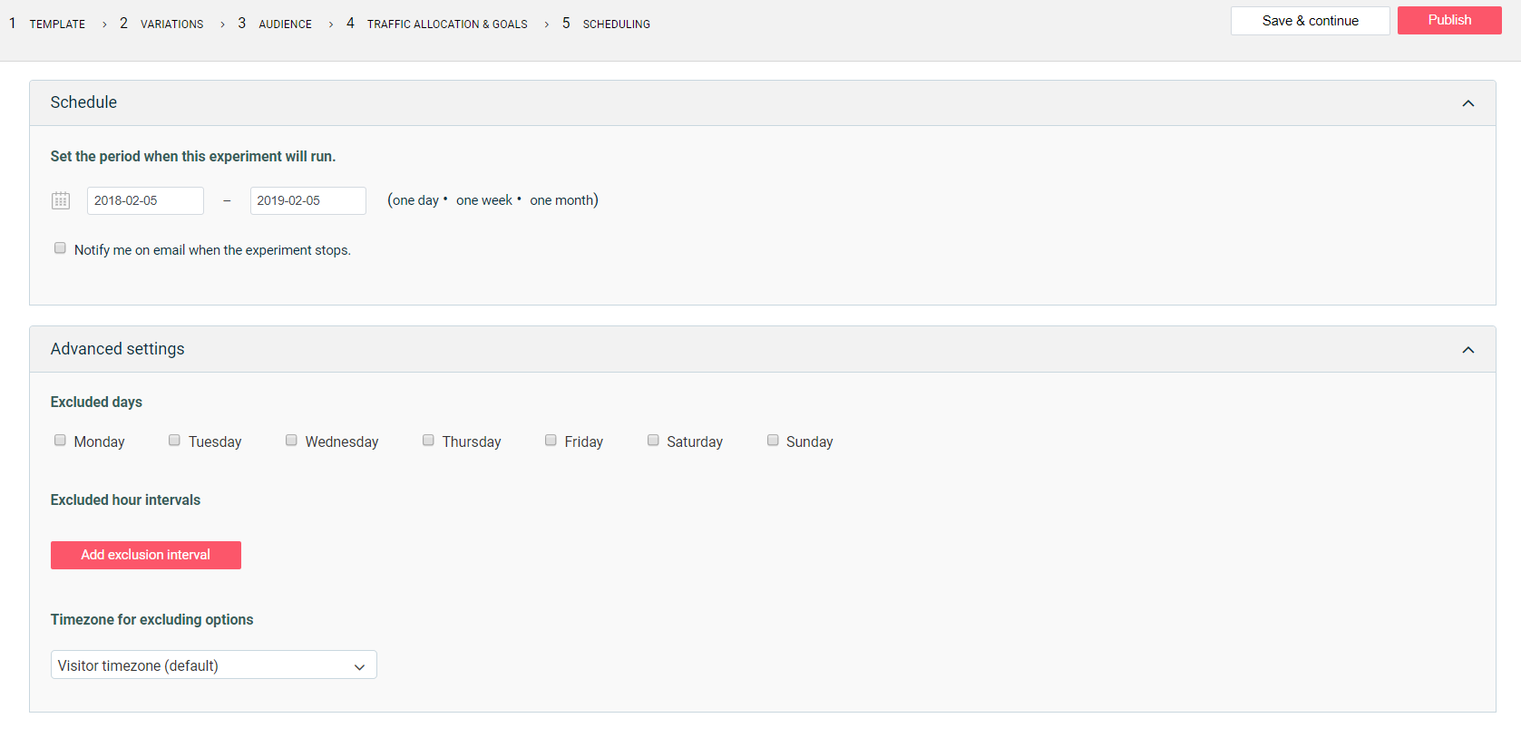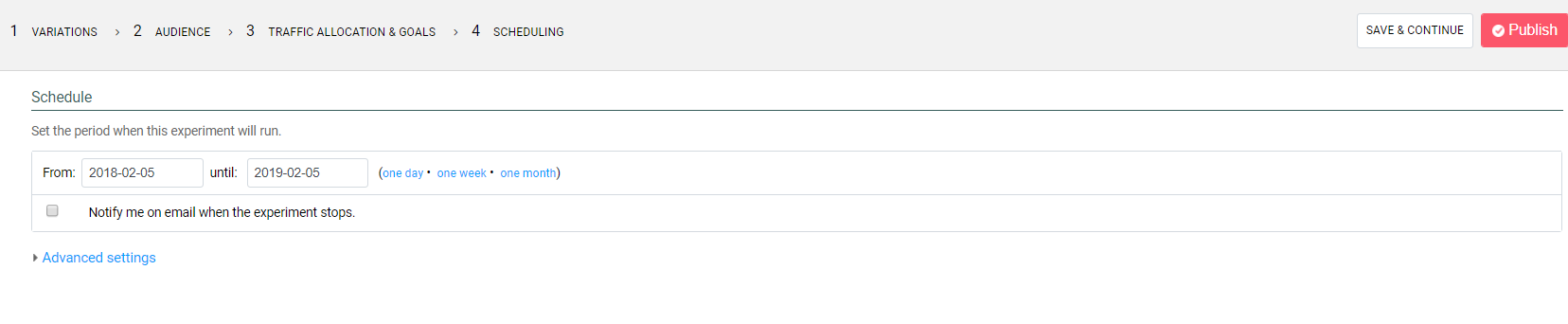 Finally, you get to the scheduling page, which sets up the time frame in which the test would be done, the advanced settings show other options, such as what days would you like the test to be run, and filters that help create a more focused result. Once finished, you can now publish and run your test.