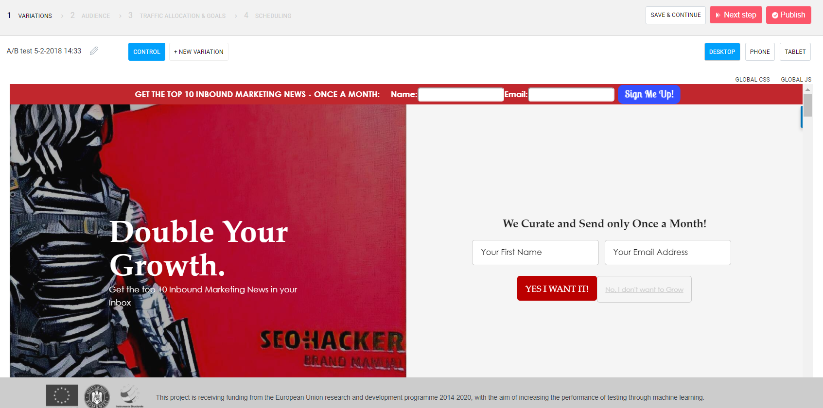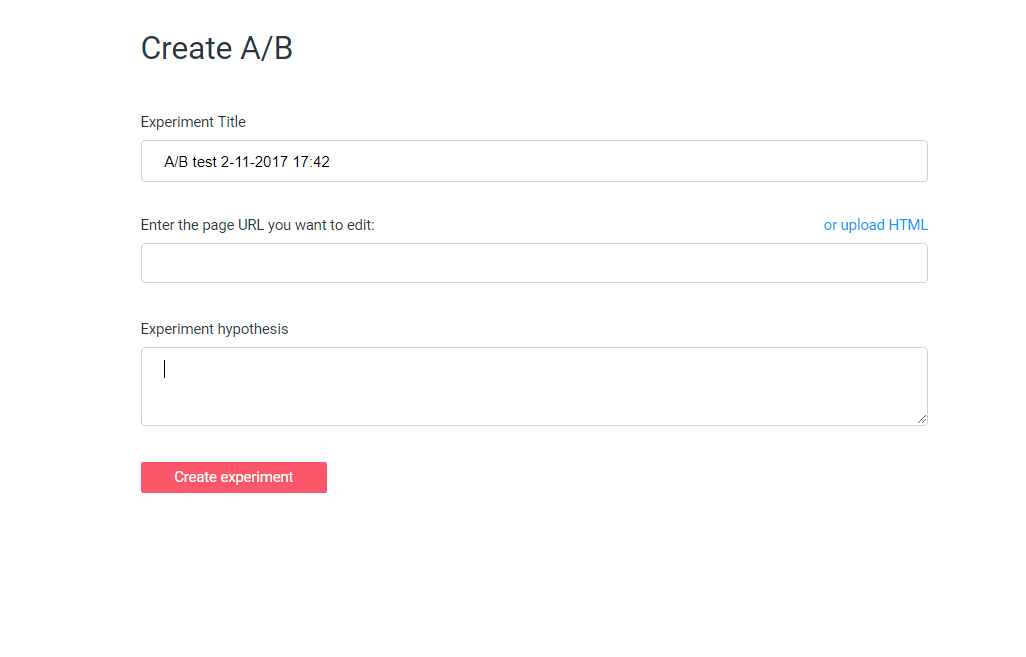 Now, let’s use the A/B Testing feature, which is one of the highlight features of this tool. Creating a test is a simple process of filling up the required fields, which include the title, the URL you would be editing, and the experiment hypothesis. After entering the URL and hypothesis, You would be entering the Testing page, where you get to edit the different variations of your website, and create a controlled variable.