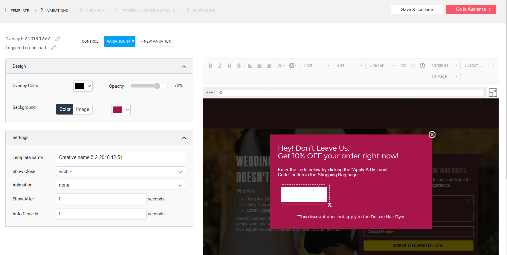 Using overlays is a great method of interacting with your audience, converting for sales, add to your subscription list, and even create more leads. Adding overlays using Omniconvert is a simple process, as you can use a series of templates that you can customize and edit. You can also create your own templates, which means you can access some of the older ones that you have made, and re-edit them accordingly. The overlay creation page begins with the creation of templates and variations. The Variations section allows you to edit your template, and add text, colors, and even animation. For those who are familiar with photo or layout editing software, this comes as something familiar.