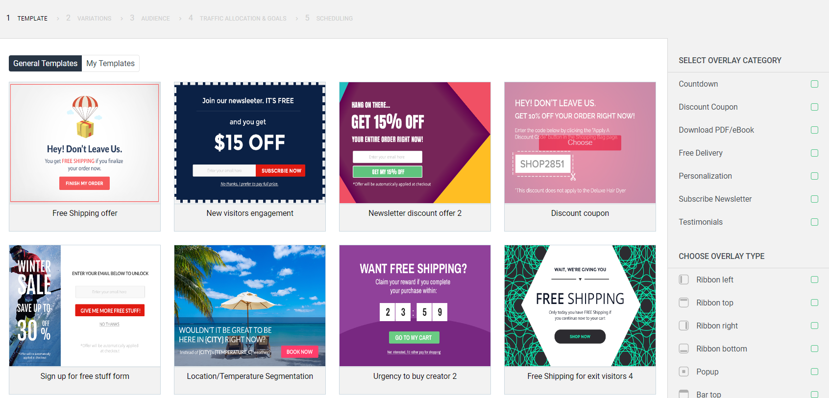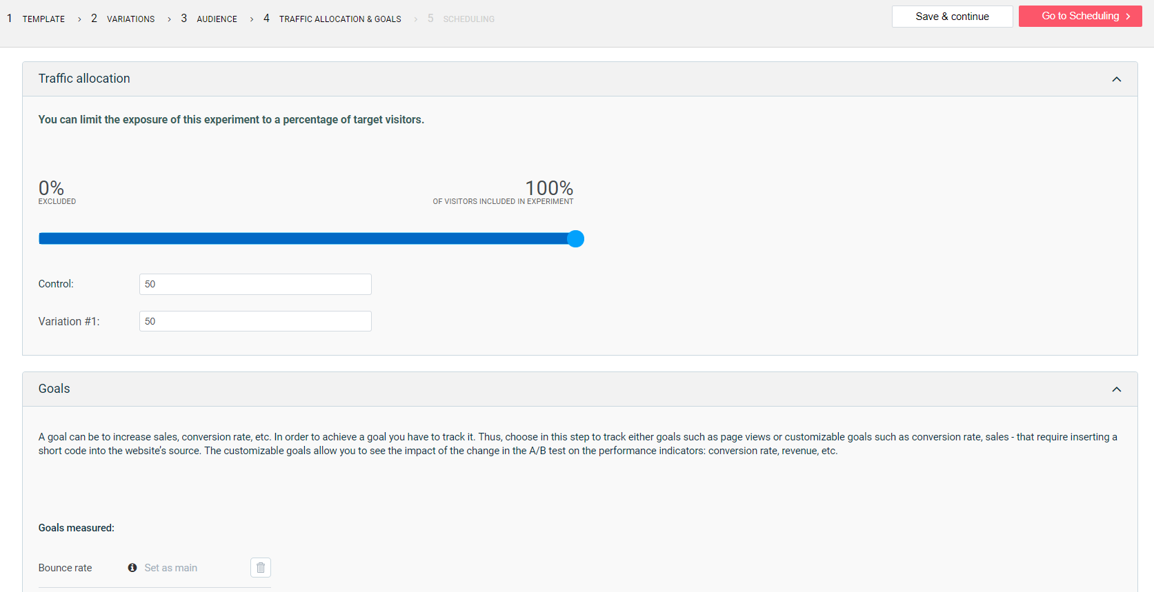 The fourth section is the Traffic and Allocation. This allows you to set up your own goals, like reducing the bounce rate, increase engagement, or convert more sales. You also have the choice to limit the exposure of your overlay to get a more concentrated amount of audience in your website. ![]()