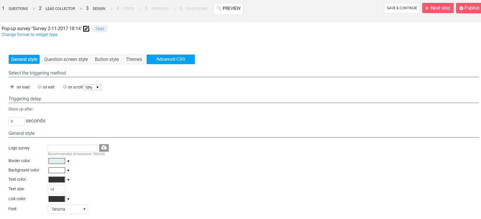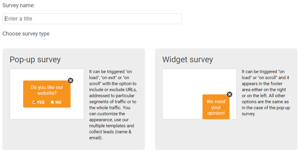 Along with creating tests and overlays, you can also create surveys for your website. Once you click the create survey button on the dashboard, you can immediately begin creating a survey. You can choose between two survey types, pop-up, and widget survey. For this review, we’ll be making a pop-up survey.