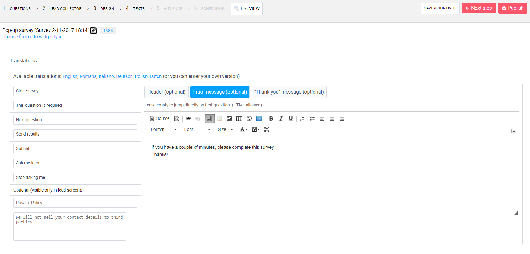 Once you select the survey type, you can now design and edit the survey. Omniconvert allows you to create the whole survey, from the opening message, survey items, to the thank you message in the end. You can also schedule and segment the number of people taking the survey as well. Once you are finished, you can instantly publish the survey into your website.