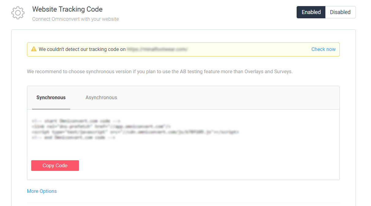 Once you have added your website, the next step is to add a tracking code to your website. This allows you to connect your website with Omniconvert and allows seamless integration. Just in case your tracking code could not be detected, like the example above, you will be notified immediately. You can choose between a synchronous and asynchronous tracking code, which you can copy and paste easily. This will allows your website to track down and send website data to Google Analytics. Monitoring your website is always a priority, and tracking codes help you gather more useful data.