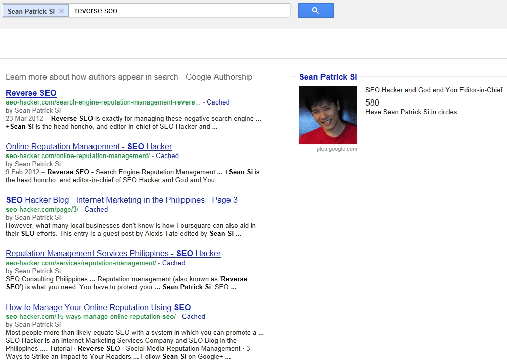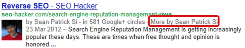 Clicking on the ‘More by(author name)’ link on the SERP snippet will take the user to a page where all of the author’s other published entries are displayed. This means that the user can check out your vertical mastery of your topic, your writing voice in your other published articles, other websites where you write in, etc.