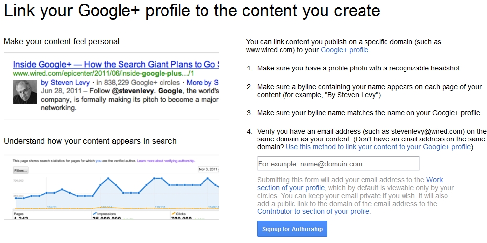 - Visit the Authorship page and submit your email address to Google. No matter how many articles or posts you publish on this domain, you only need to do this process once. Your email will appear in the Contributor to section of your Google+ profile. If you want to keep your email private, change the visibility of your link.
