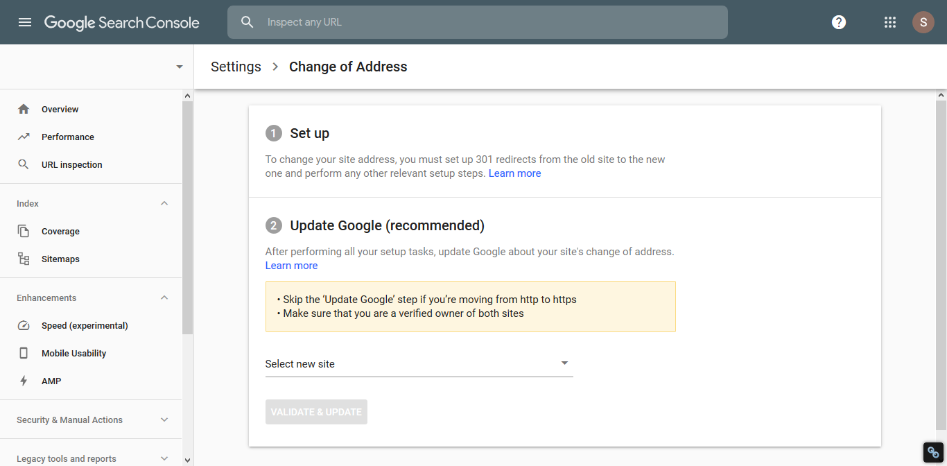After 301 redirecting the pages, most webmasters forget to use a vital tool regarding site migrations – Google’s change of address tool. Here’s how to use it:
