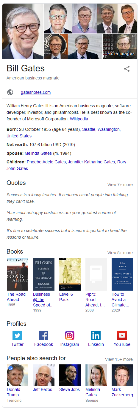 Here’s an example of a complete knowledge graph or panel for the search term for “Bill Gates”. It contains most of the information that people commonly need to know about this specific person. The details include: