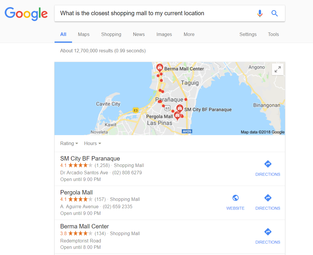 Take this query, for example. When I asked Google about “What is the closest shopping mall to my current location”, it immediately responded by giving me a list of the nearest shopping malls. Other search engines tend to read only the keywords of your search term, like “shopping mall”, but Google takes into account the whole statement, which helps it “learn” language better.